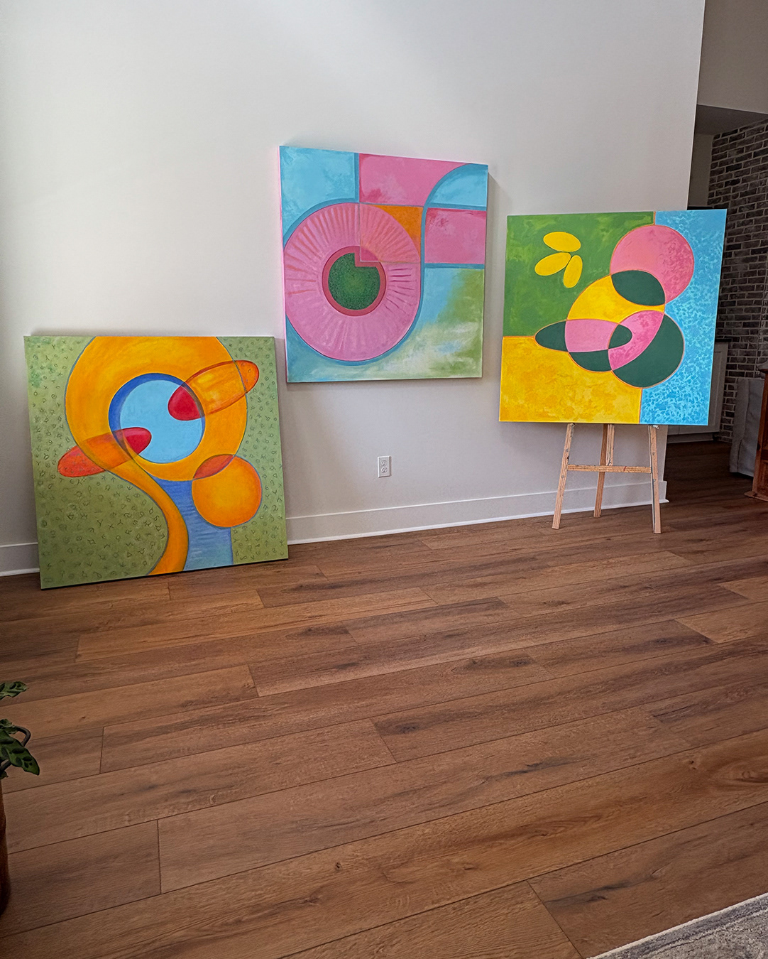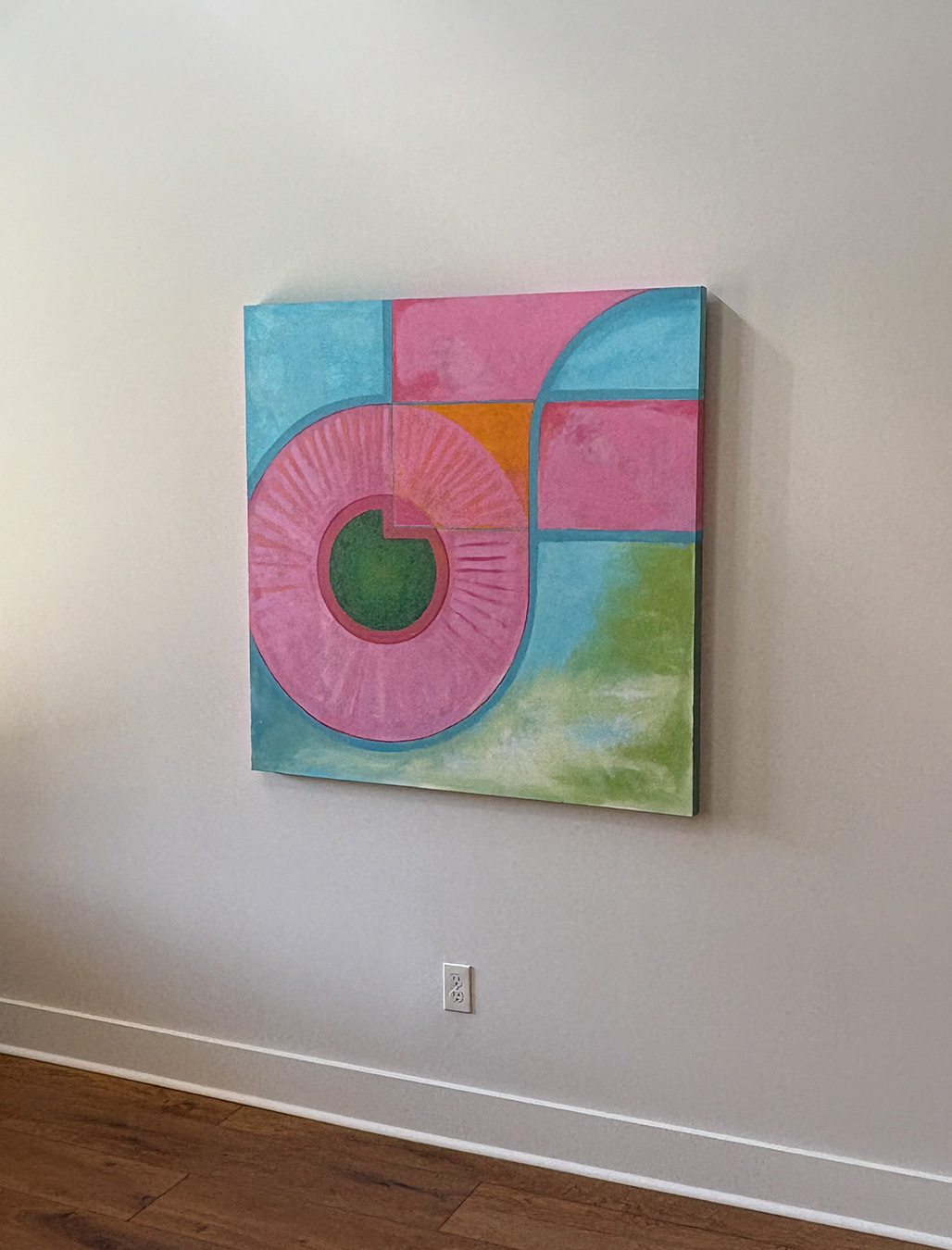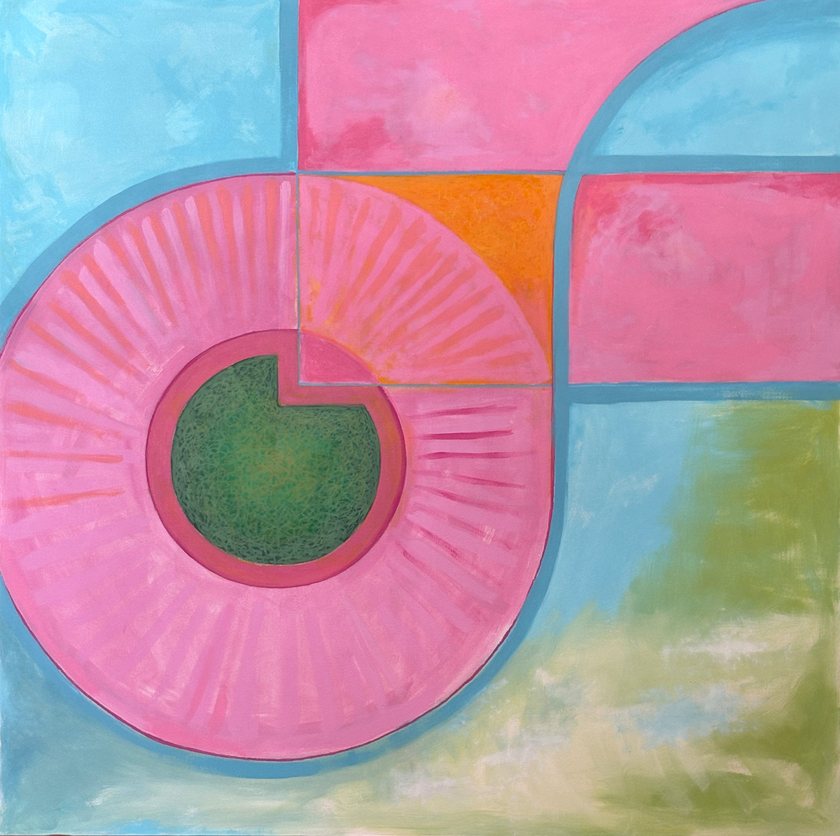 This painting centers on a circular form that organizes the surrounding space through containment and interruption. Curved boundaries and segmented color fields establish a visual rhythm, allowing movement to circulate inward rather than extend outward.